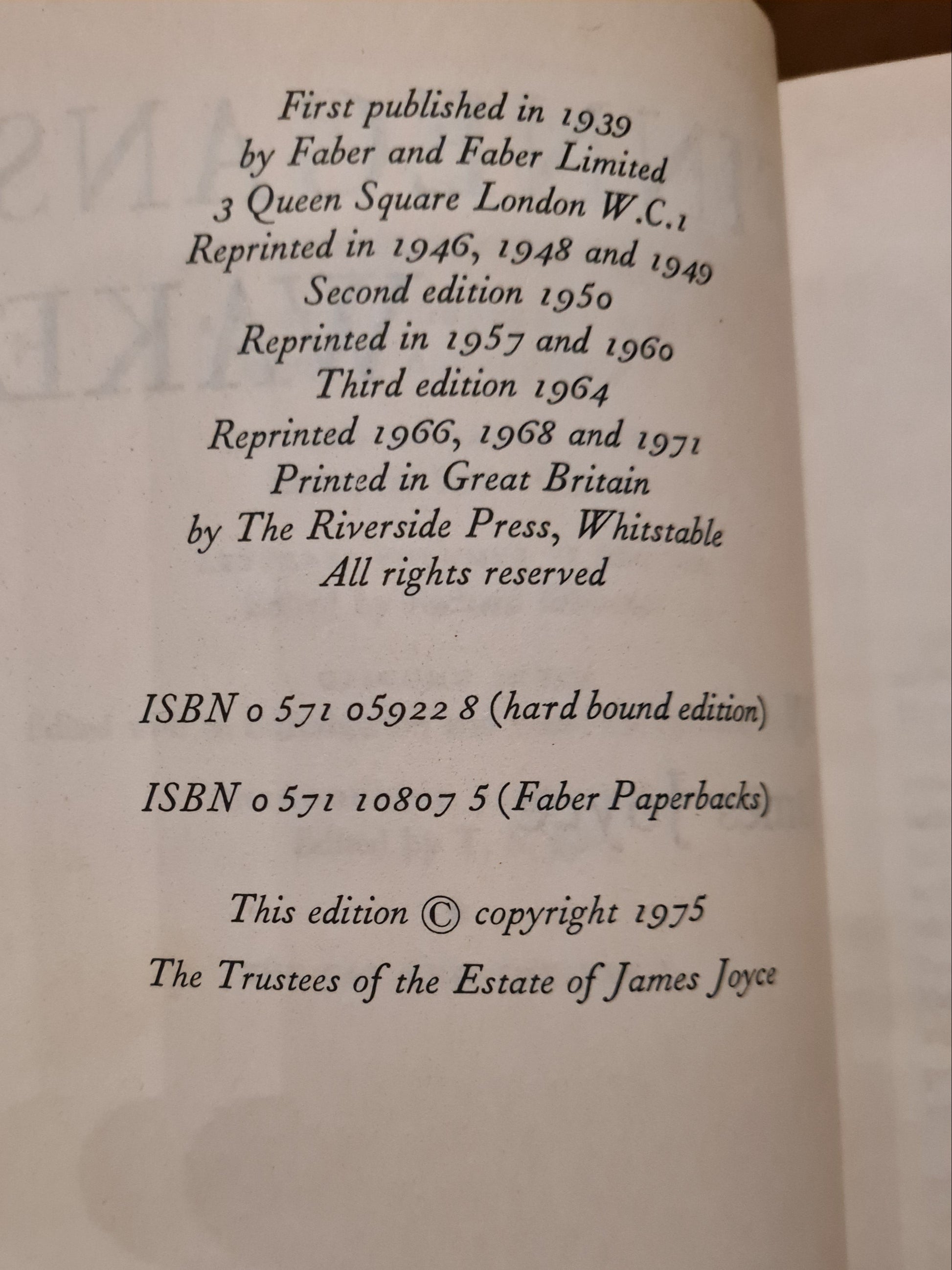 Extremely rare 1975 fifth reprint of the third edition (Faber, 1964) of Finnegans Wake. In an unclipped dust jacket with only one very minor nick on upper corner. This book is unmarked and in very good condition throughout. [Little Lane Bookshop]